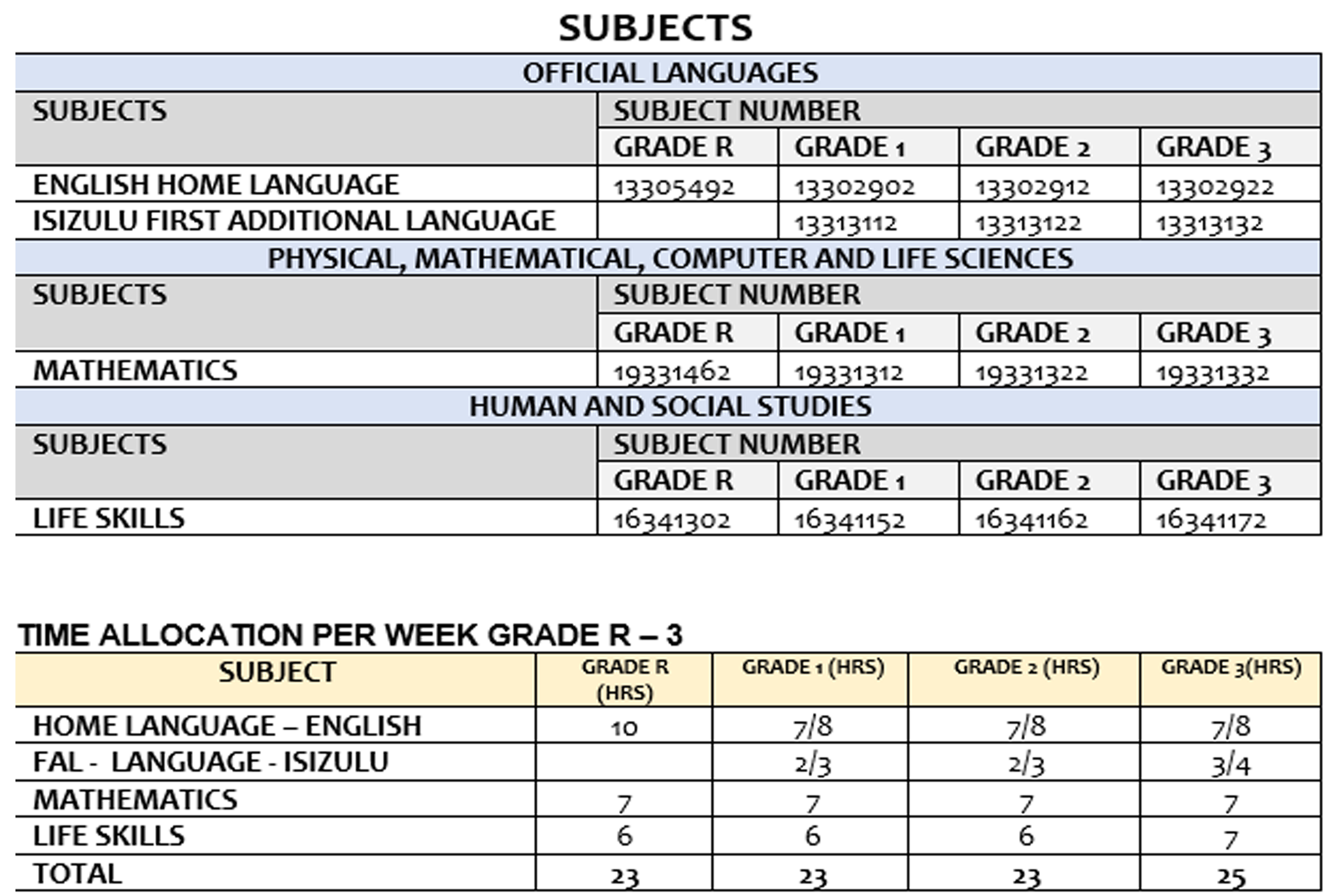 - The instructional time for Grades R, 1 and 2 is 23 hours and 25 hours for Grade 3.